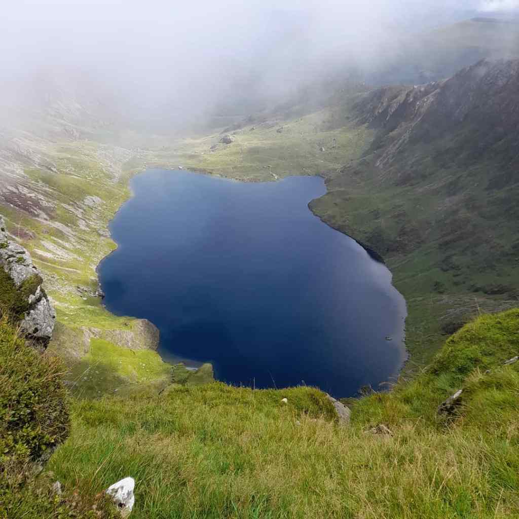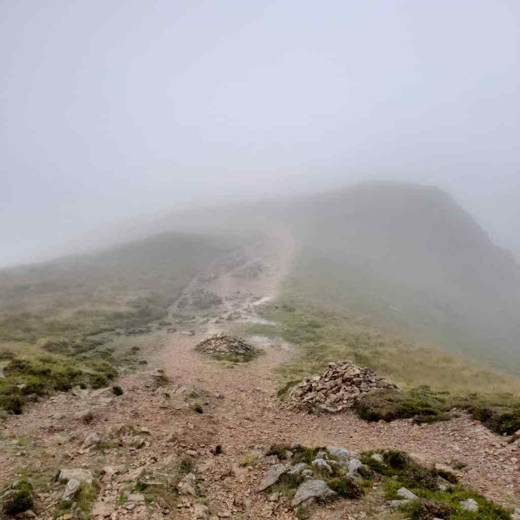 Soon I found myself and somewhat of a false summit where the trail dipped and then began to climb again. The clouds were at this time shifting and I was able to look to my right and see the immense drop all the way back to the lake. I decided to take a couple of steps to the left and continue! It was also at this point I bumped into some other walkers; I’d like to say I don’t mean that literally but sadly that was indeed the case. Fortunately, neither of us fell to the lake and we decided to team up at least till the clouds cleared; they did not. However, we managed to find the summit at which there is a little shepherds hut and a maker stone so you know you can stop walking and crack out the sandwiches. I did exactly that and hoped the clouds would clear so I could take in the view.