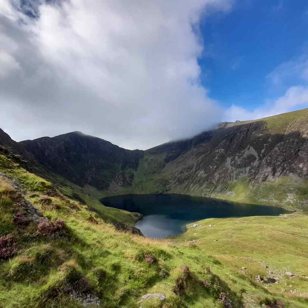 At the precipice where the climb starts to level out, I was unfortunate enough to enter the clouds. As atmospheric and cooling as this was, my hike took place on a rather warm day, it meant getting lost was very easy and something I managed to do soon after the clouds came in. It was only when I was knee deep in heather bushes, I realized I must have diverted from the well-trodden path onto a sheep trail, this was confirmed by the sheep trying to walk the other way, startled by myself only 2 feet away through the thick cloud. I turned back and managed to find my way back to the trail and continued to the rim of Cadair Idris ever climbing.