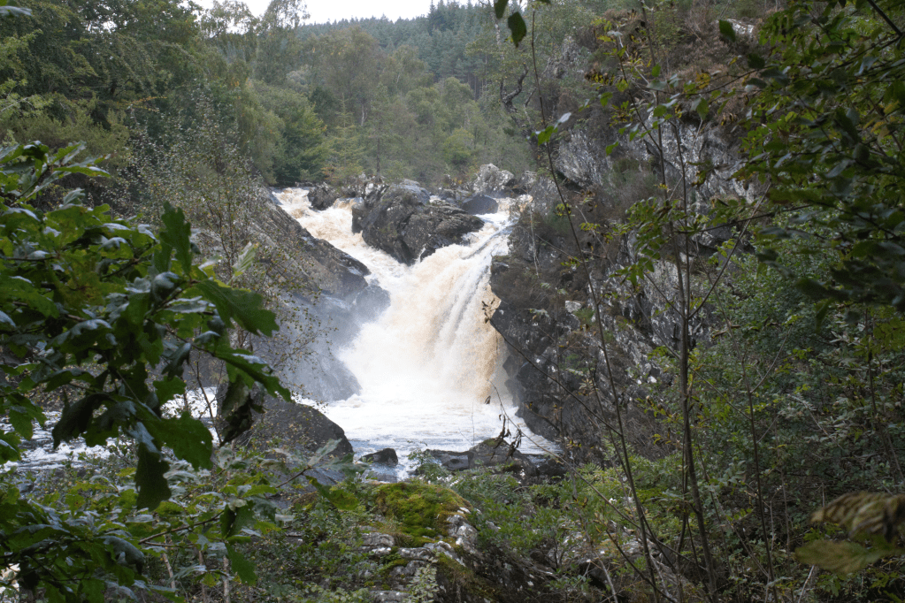 A view of the Rogie Falls through the trees.